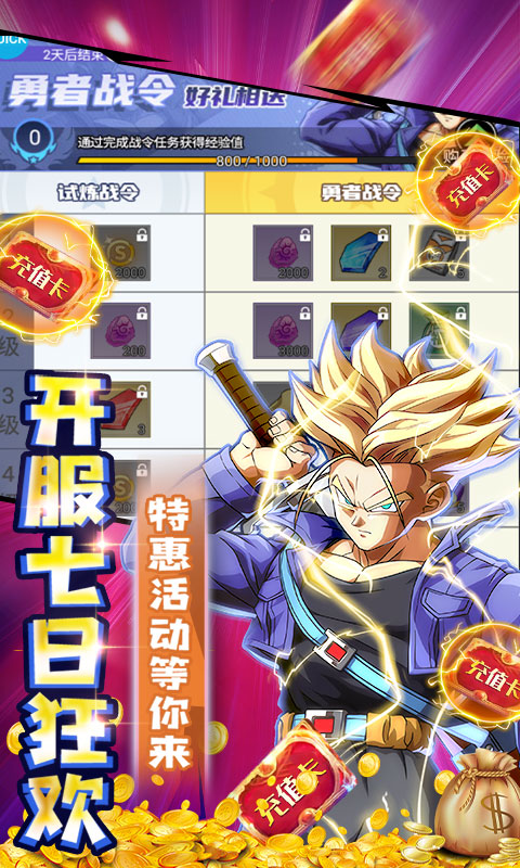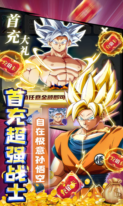 3.充值比例1:500,首充双倍钻石返利,首充即送SSR角色【自在极易 孙悟空】,极品橙装,海量金币,以及各种稀有道具。